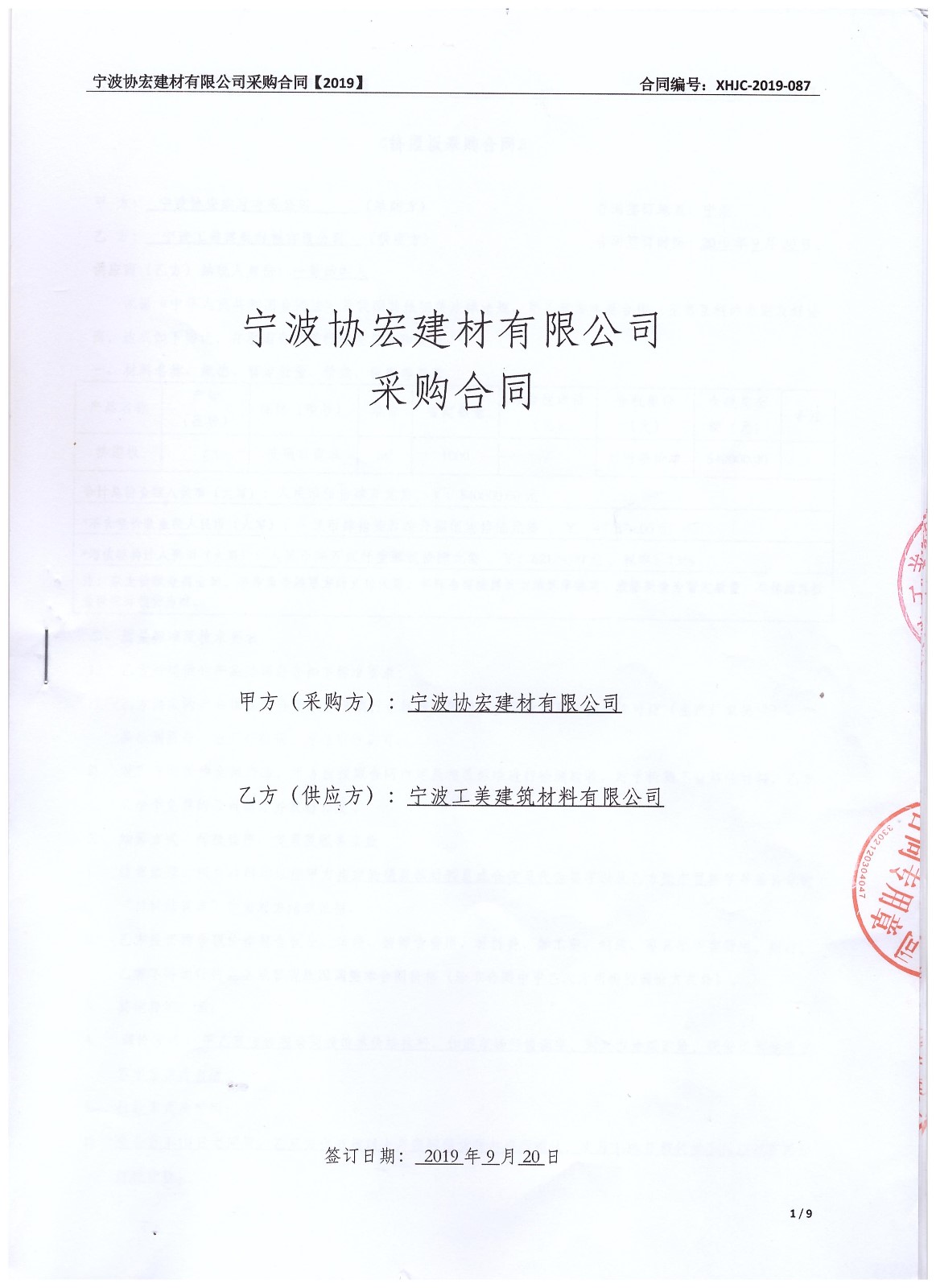 【寧波工美建筑材料有限公司】與寧波協(xié)宏建材有限公司簽約的戰(zhàn)略合作合同,其中包括巖棉板和擠塑板的供應(yīng),我公司將保質(zhì)保量完成材料的供應(yīng)。 (附:圖片和合同)